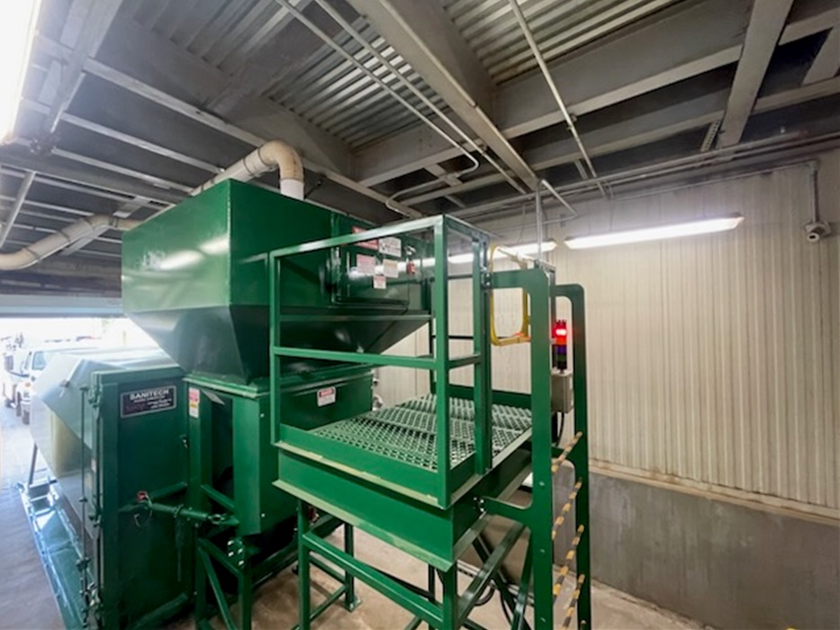The project included a raised compactor with a custom ladder, platform, and hopper. Becker handled the on-site installation and connection to the existing Starbucks feed system.
